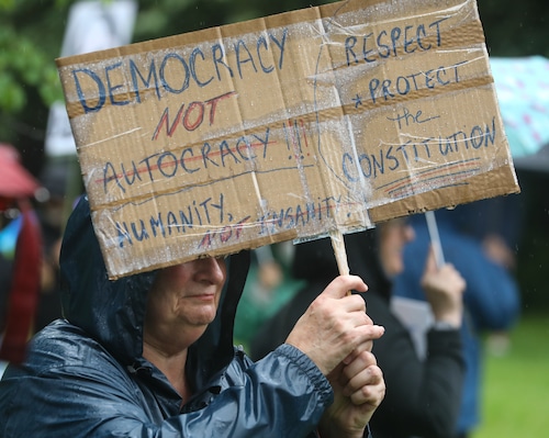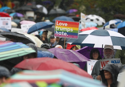 People held up signs throughout the crowd. “Democracy, not autocracy,” one read. “Love trumps hate,” read another.
