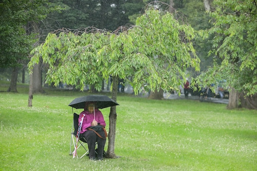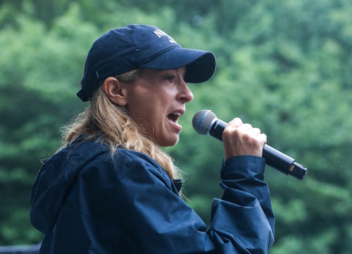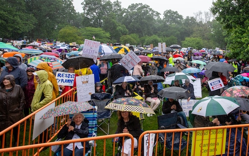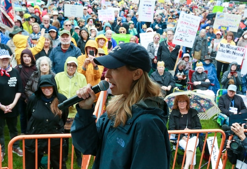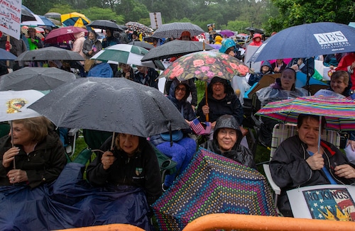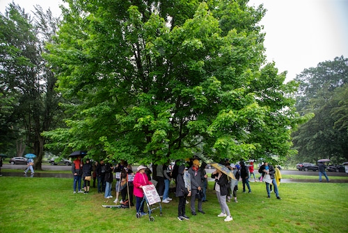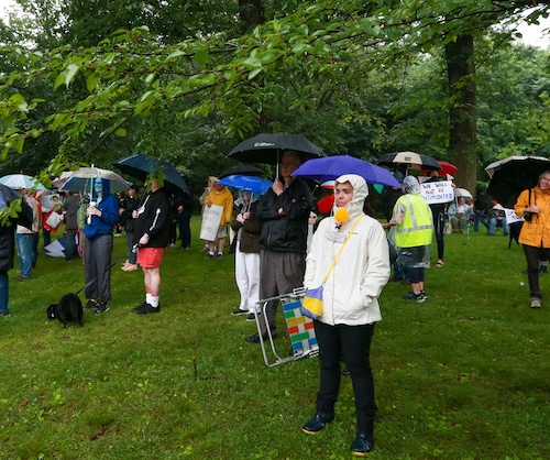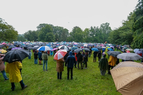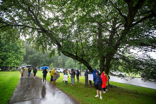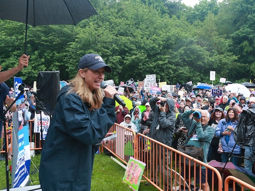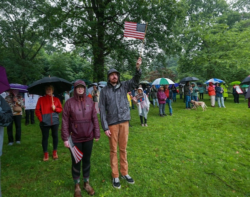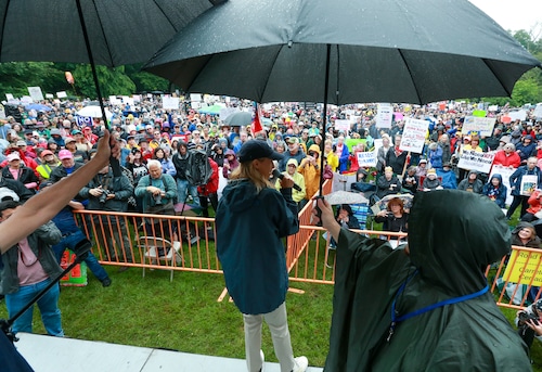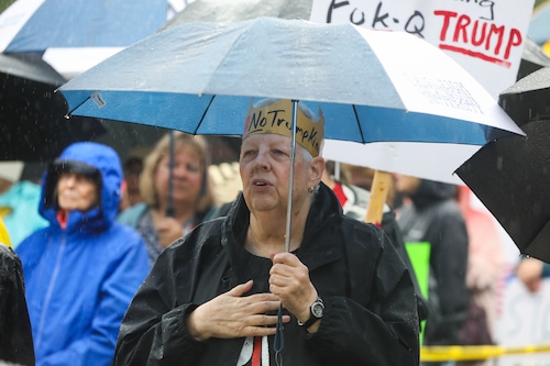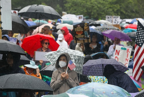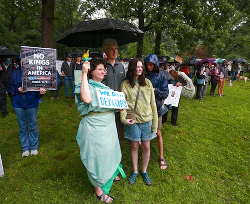 In Montclair, hundreds of people holding umbrellas gathered to demonstrate. In a speech to the crowd, U.S. Rep. Mikie Sherrill, the freshly minted Democratic nominee for governor, echoed the theme of the event: that Trump has been acting like a monarch.