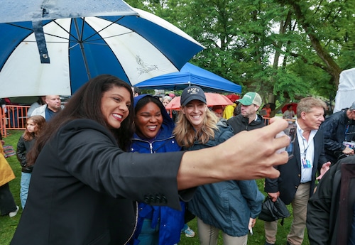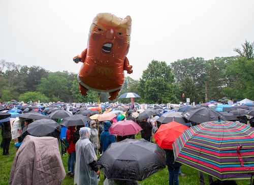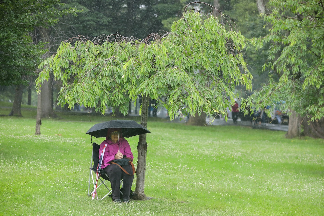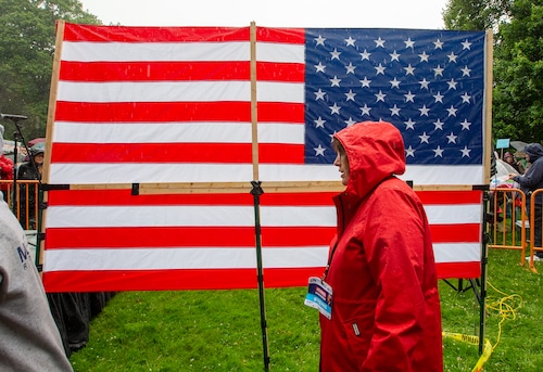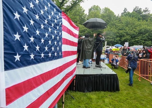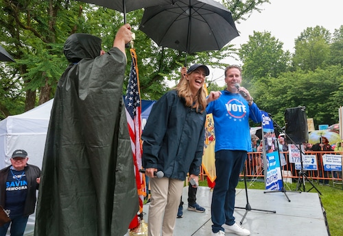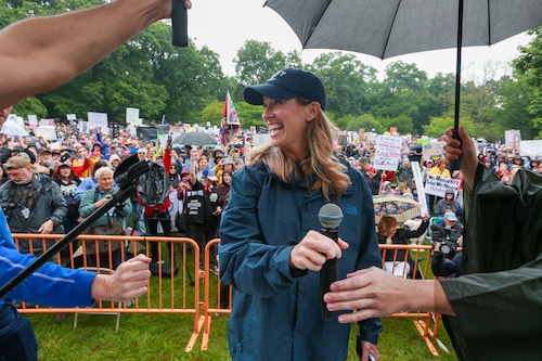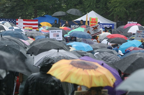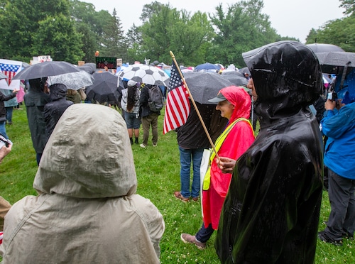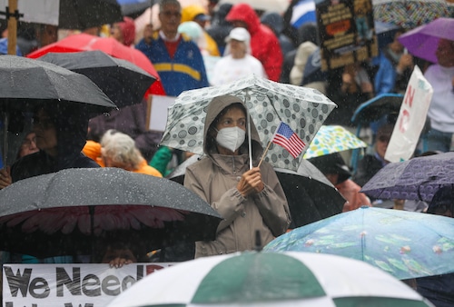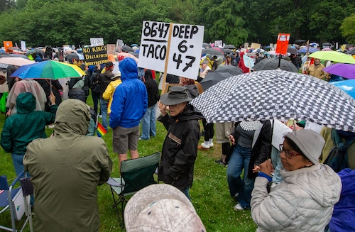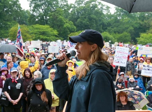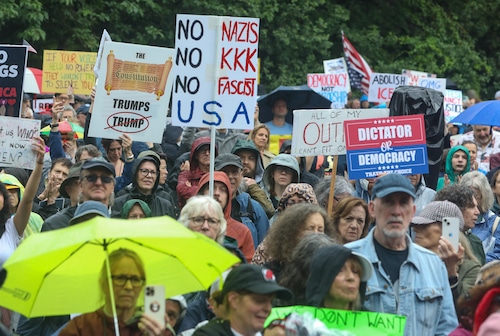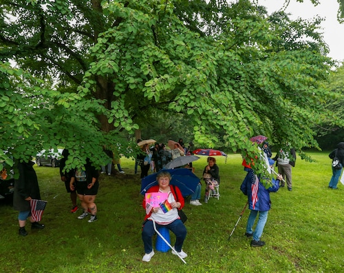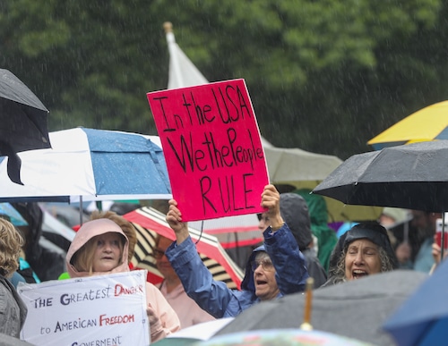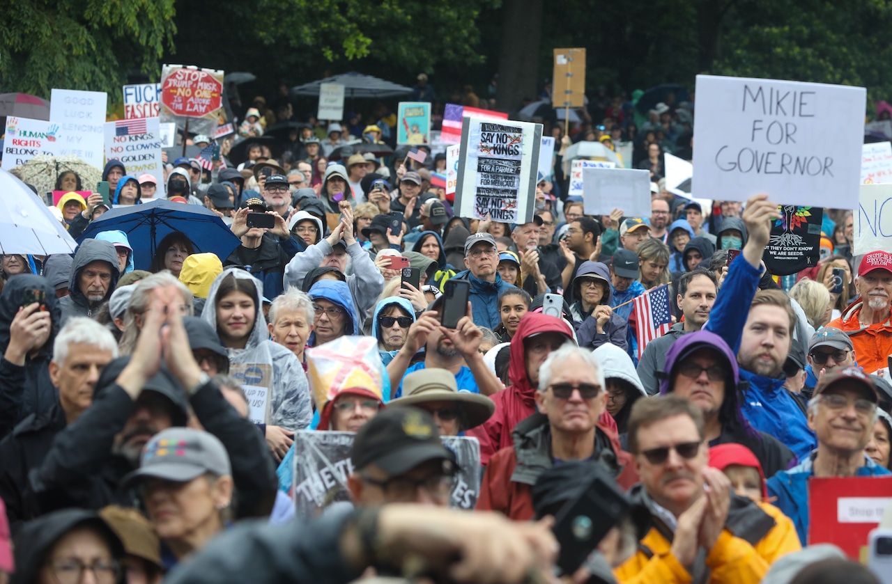 In Montclair, hundreds of people holding umbrellas gathered to demonstrate. In a speech to the crowd, U.S. Rep. Mikie Sherrill, the freshly minted Democratic nominee for governor, echoed the theme of the event: that Trump has been acting like a monarch.